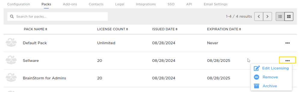 Feature Description Edit Licensing Adjust the number of licenses assigned to the child account and update the expiration date for the pack licenses. Remove Remove the pack entirely from the child account. This action will delete all associated data and ensure you are no longer billed for these specific pack licenses. Archive Archive the pack will preserve all its data. This action will ensure you are no longer billed for these specific pack licenses.